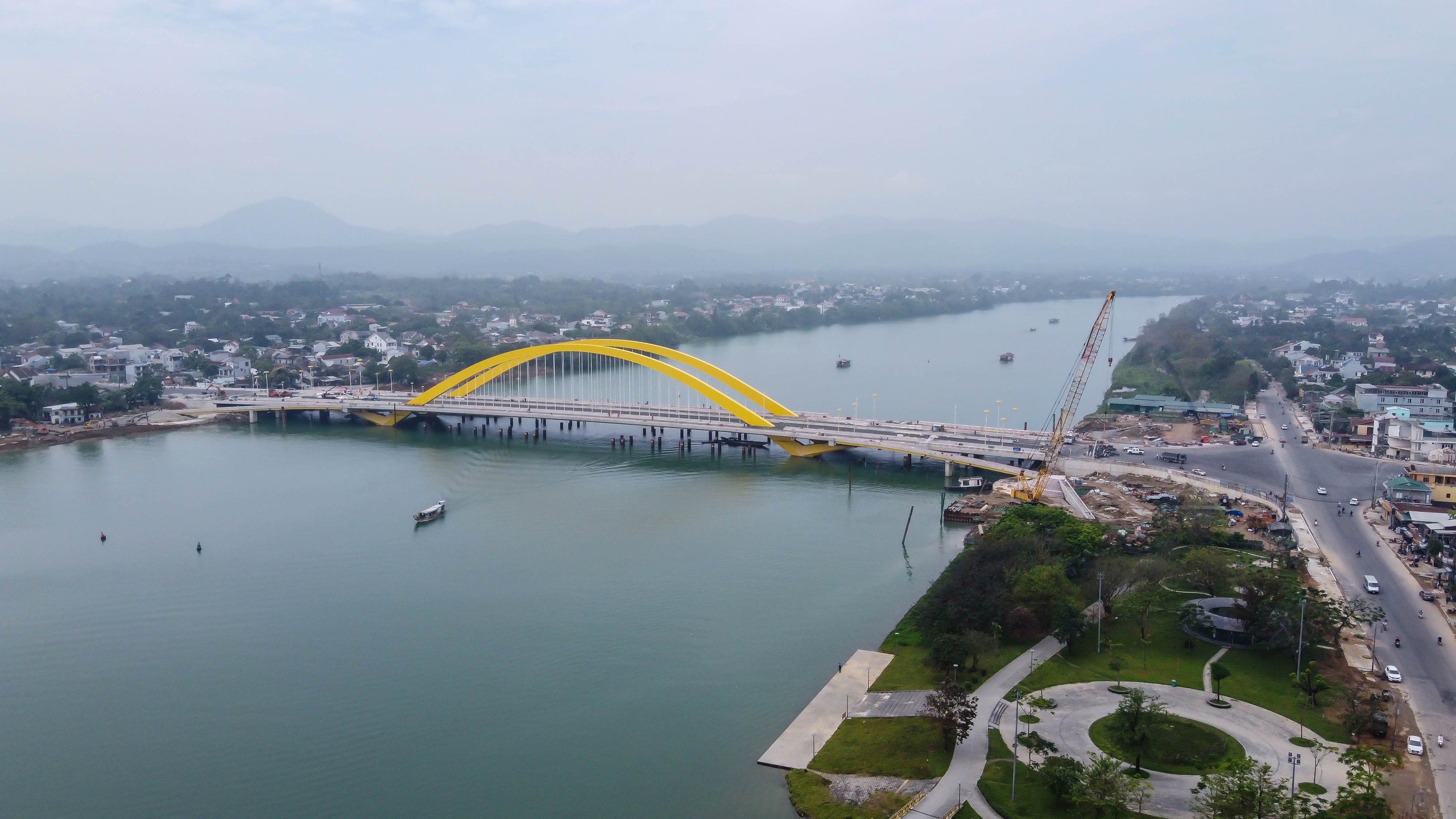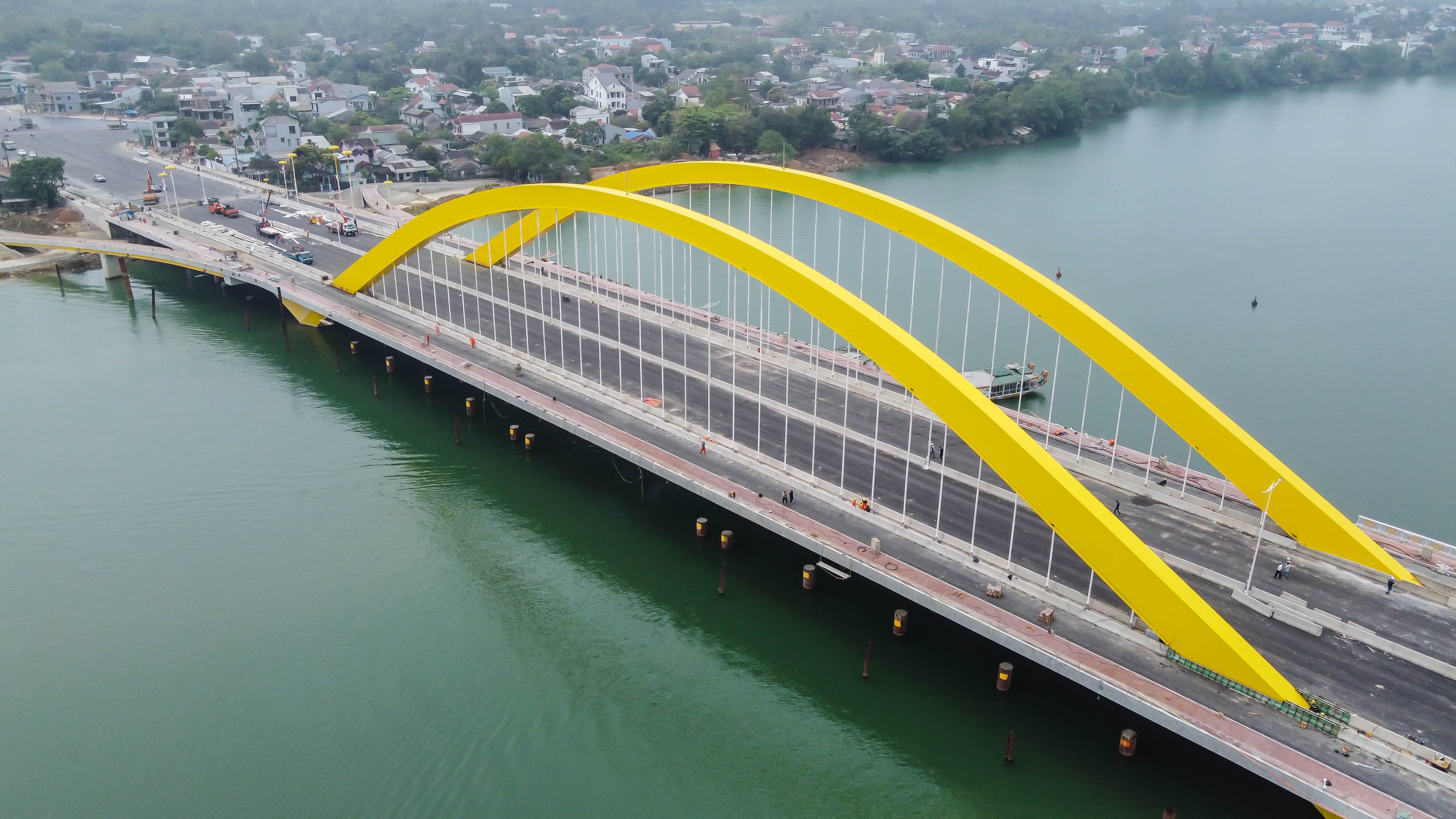 Cầu Nguyễn Hoàng bắc qua sông Hương chuẩn bị thông xe kỹ thuật sau 2 năm thi công. Chỉ vừa xuất hiện những hình ảnh đầu tiên, cây cầu đã gây chú ý bởi hệ thống trang trí được thiết kế theo hình những chiếc lọng vàng cung đình.