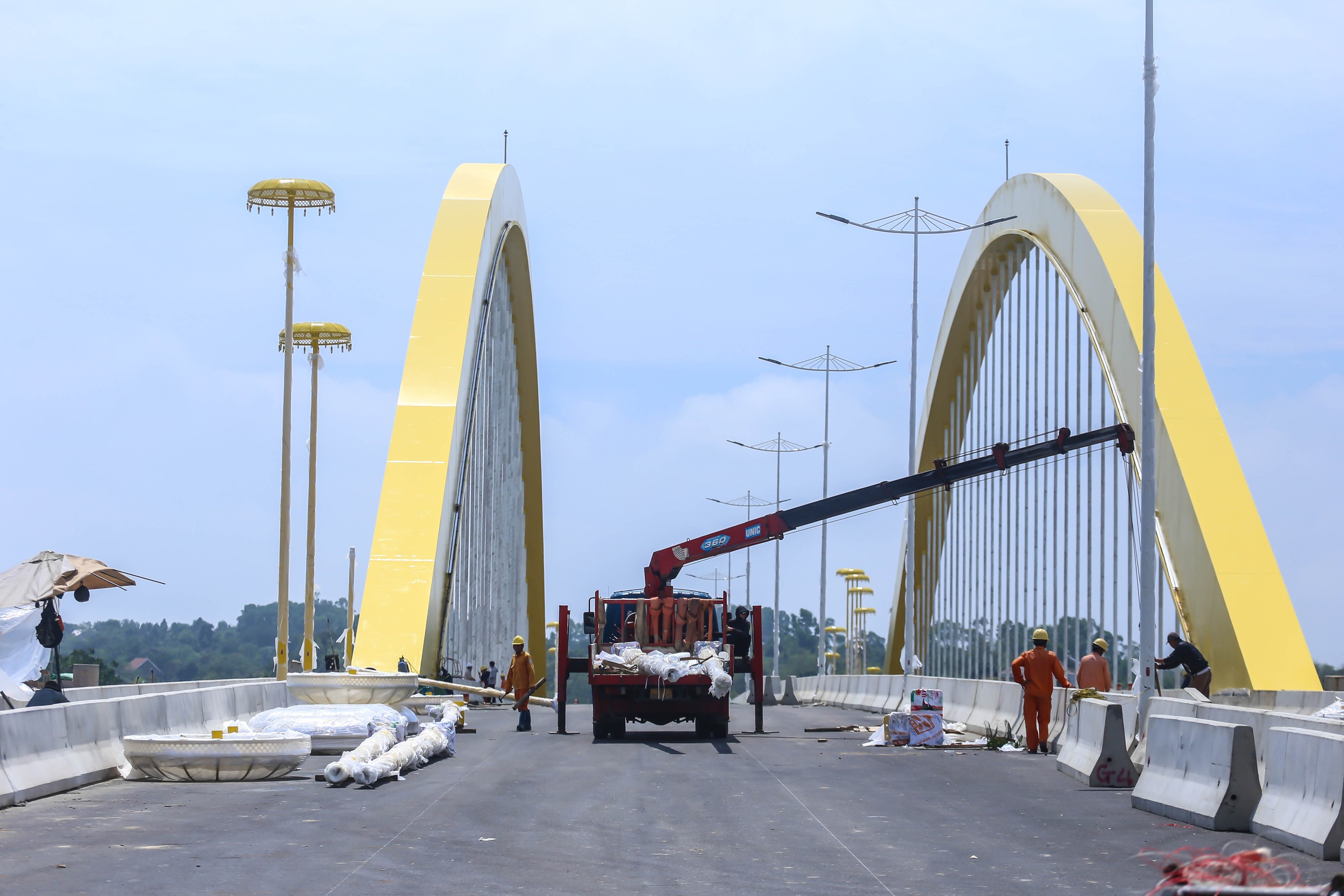 Theo ghi nhận của Thanh Niên, thời điểm này, cầu Nguyễn Hoàng đã cơ bản hoàn thiện. Sau 2 năm thi công, cầu đã được thảm nhựa mặt cầu, lát gạch đỏ lối đi bộ, lắp đặt hệ thống thống lan can, đèn, sẵn sàng “về đích” đúng hạn… Đáng chú ý nhất là hệ thống đèn chiếu sáng hình lọng cung đình vừa được dựng lên.
