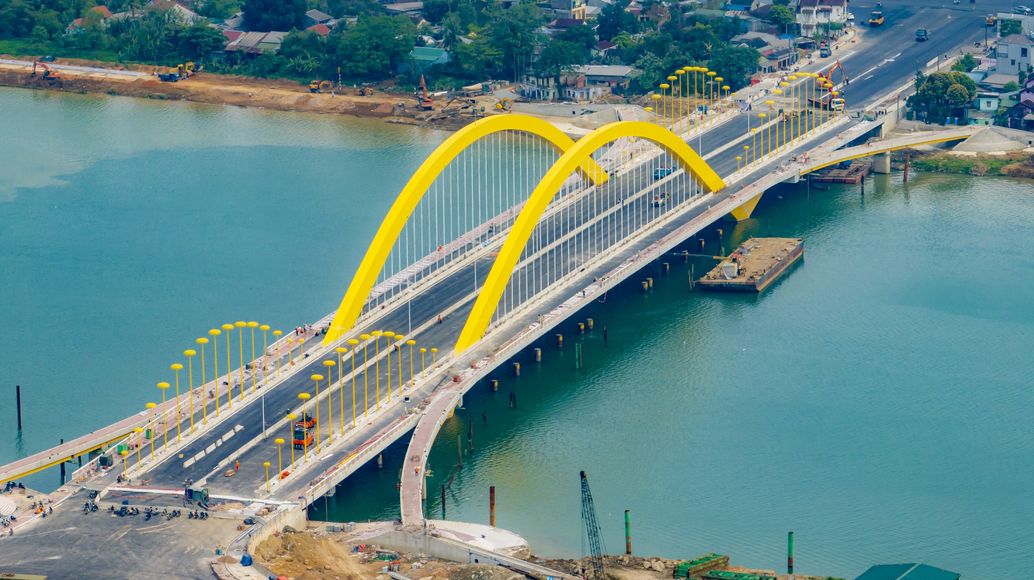 Theo ghi nhận của Thanh Niên, thời điểm này, cầu Nguyễn Hoàng đã cơ bản hoàn thiện. Sau 2 năm thi công, cầu đã được thảm nhựa mặt cầu, lát gạch đỏ lối đi bộ, lắp đặt hệ thống thống lan can, đèn, sẵn sàng “về đích” đúng hạn… Đáng chú ý nhất là hệ thống đèn chiếu sáng hình lọng cung đình vừa được dựng lên.