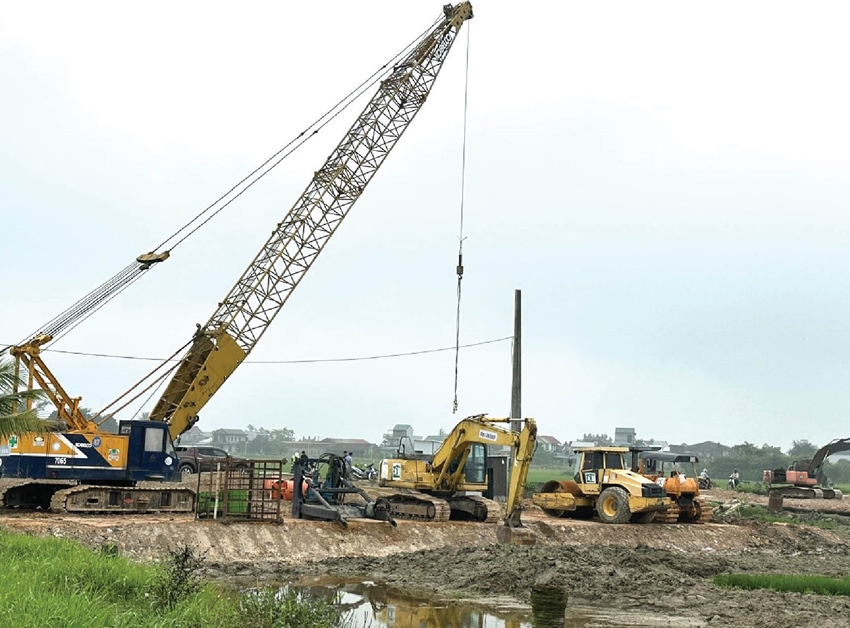Sau khi khởi công dự án, tranh thủ thời tiết nắng ráo, các đơn vị đã tập kết nhiều loại máy móc, phương tiện đến địa điểm thi công để cào bóc phong hóa đất hữu cơ bề mặt ruộng, tạo bề mặt nền.